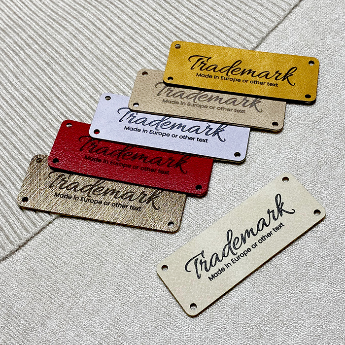This Faux leather label Model EP-M143 can be customized just in a few seconds, very simply and quickly using the graphic builder, where you can choose the color of the faux leather, you can insert your own logo or any other graphics with a complex design, and you can customize the label with your own text, for example your brand name, a slogan, manufacturer's name, and the country where your product was manufactured.