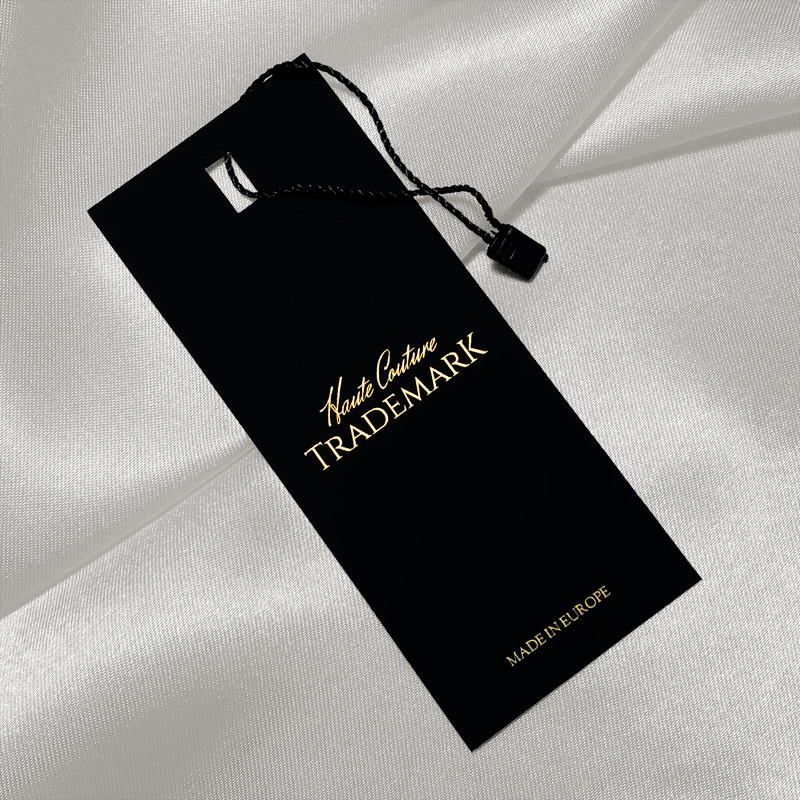 Black label with gold writing made of thick laminated cardboard Soft Touch, with plastic seal with string included, suitable for various clothing products. This type of hang tag is made of high quality materials, using the most advanced technologies in the field of Digital print and finishing.