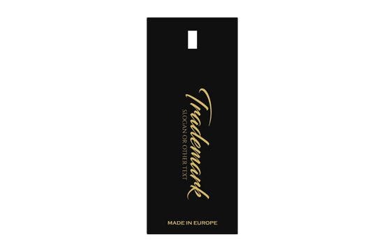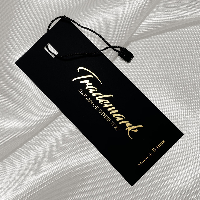 Label with string for hanging clothes or other clothing products, made of thick cardboard laminated with Soft Touch foil with gold writing. This type of hang tag is made of high quality materials, using the most advanced technologies in the field of Digital print and finishing.