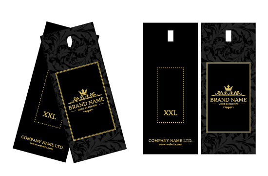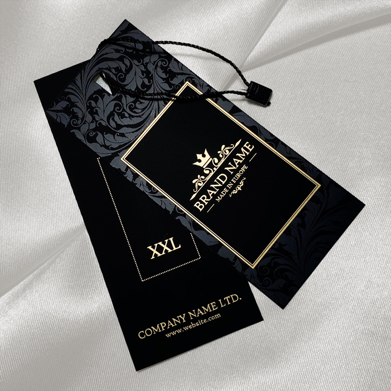 Clothing labels with a Premium design and seal with a black string included, made of Soft Touch laminated cardboard and personalized writing with gold foil. This type of hang tag is made of high quality materials, using the most advanced technologies in the field of Digital print and finishing.