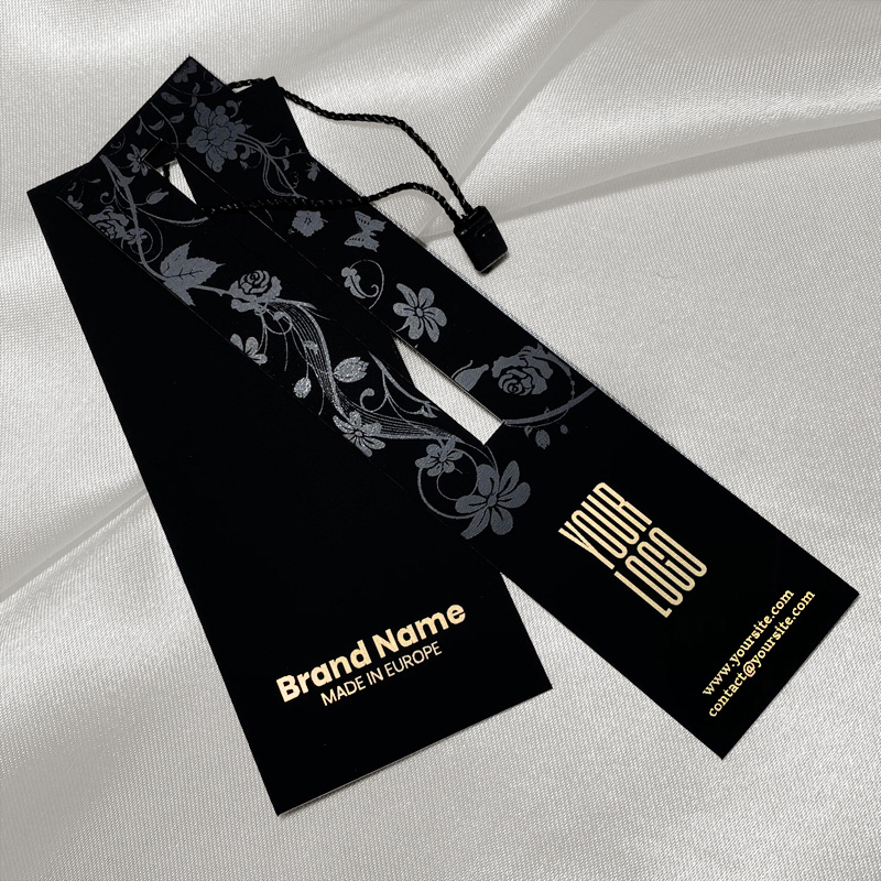 Elegant set of cardboard hang tags with black plastic seal included made of high quality materials for various textiles, such as women's clothing, dresses, men's clothing, pants, jackets, etc. This type of hang tag is made of high quality materials, using the most advanced technologies in the field of Digital print and finishing.