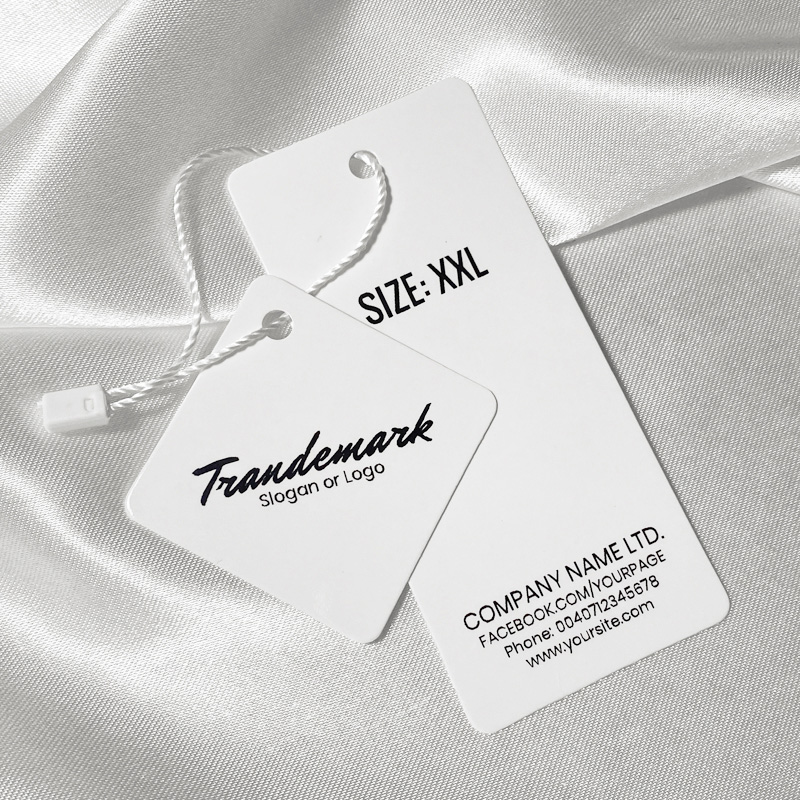 Cardboard labels for clothes with white seal, made of thick laminated cardboard with glossy foil and personalized with text or Brand logo. This type of hang tag is made of high quality materials, using the most advanced technologies in the field of Digital print and finishing.