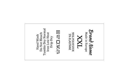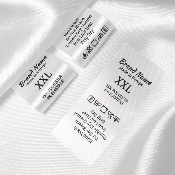 Customized size laundry care label on a fine white satin, suitable for clothes, various clothing and textile products. This type of textile label is made using the most advanced technologies in the digital printing field on a textile support. The labels are printed on a special satin by thermal transfer method, with an impressive print quality and high wash resistance.