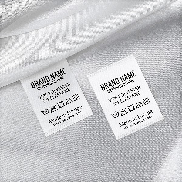 Laundry care label customized with brand name, fabric composition, washing and care symbols, printed on white satin and ultrasonically cut at the edges. This type of textile label is made using the most advanced technologies in the digital printing field on a textile support. The labels are printed on a special satin by thermal transfer method, with an impressive print quality and high wash resistance.