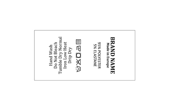 Clothing washing care label, customized with black texts printed on white satin with a fine texture. This type of textile label is made using the most advanced technologies in the digital printing field on a textile support. The labels are printed on a special satin by thermal transfer method, with an impressive print quality and high wash resistance.