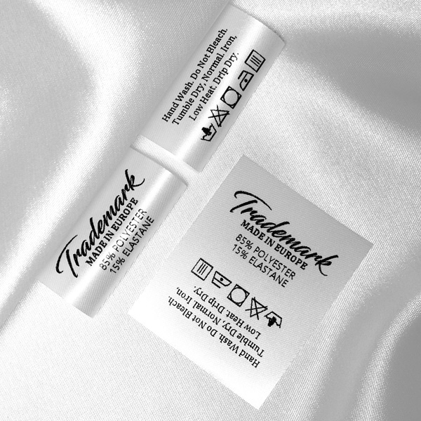 Laundry care label customized with Brand name, laundry symbols and washing instructions, suitable for clothes and clothing accessories. This type of textile label is made using the most advanced technologies in the digital printing field on a textile support. The labels are printed on a special satin by thermal transfer method, with an impressive print quality and high wash resistance.