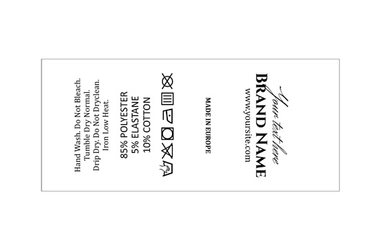 Satin fabric label customized with the Brand name, laundry symbols and washing instructions, suitable for clothes, clothing accessories and various textile products. This type of textile label is made using the most advanced technologies in the digital printing field on a textile support. The labels are printed on a special satin by thermal transfer method, with an impressive print quality and high wash resistance.