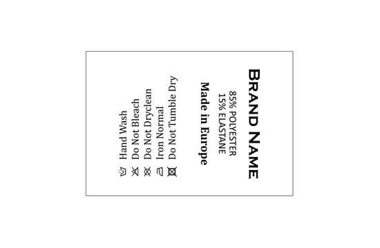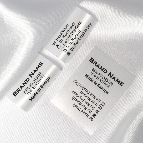 Laundry care label customized with laundry symbols and washing instructions, suitable for different clothing items. This type of textile label is made using the most advanced technologies in the digital printing field on a textile support. The labels are printed on a special satin by thermal transfer method, with an impressive print quality and high wash resistance.