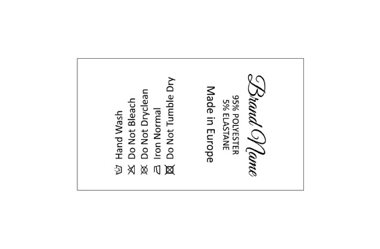 Laundry care label made on a fine white satin, customized with the Brand name, laundry symbols and washing instructions. This type of textile label is made using the most advanced technologies in the digital printing field on a textile support. The labels are printed on a special satin by thermal transfer method, with an impressive print quality and high wash resistance.