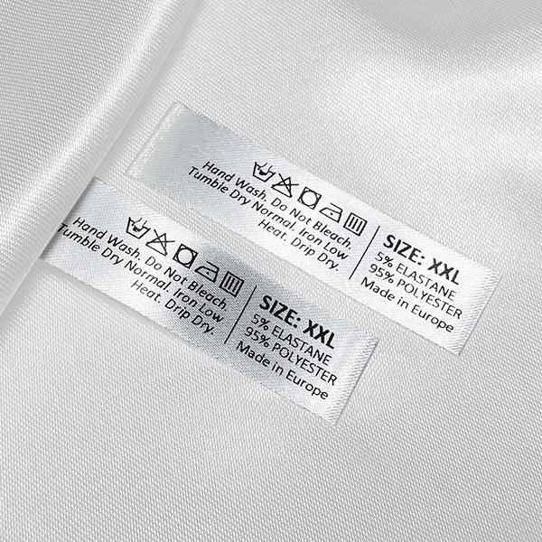 Customized satin label for clothes labeling with care and maintenance information, including washing symbols, composition and sizes. This type of textile label is made using the most advanced technologies in the digital printing field on a textile support. The labels are printed on a special satin by thermal transfer method, with an impressive print quality and high wash resistance.