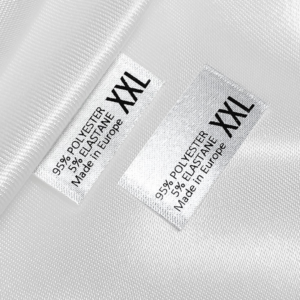 Laundry care label with the material's composition and with sizes, customized to order with the manufacturer's data and the type of material, for sewing on clothes or various clothing items. This type of textile label is made using the most advanced technologies in the digital printing field on a textile support. The labels are printed on a special satin by thermal transfer method, with an impressive print quality and high wash resistance.