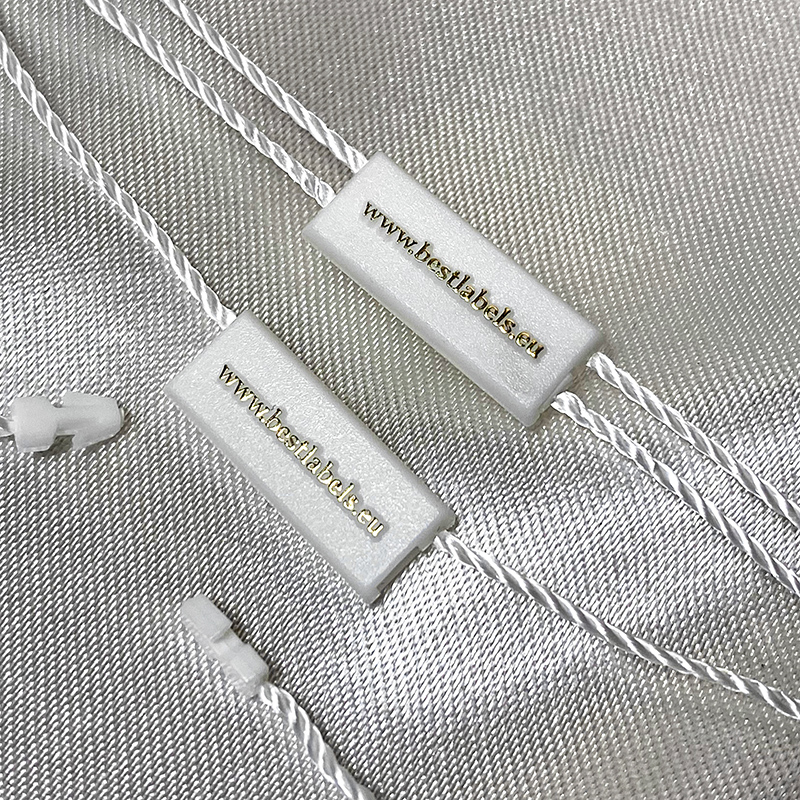 Custom plastic seal tag ST-M126 for fashion products, such as clothes, footwear, bags, jewelry, clothing accessories, etc.