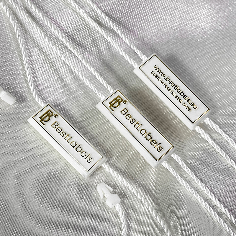 Custom plastic seal tag ST-M152 for fashion products, such as clothes, footwear, bags, jewelry, clothing accessories, etc.