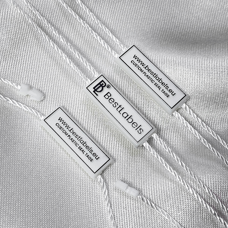 Custom plastic seal tag ST-M154 for fashion products, such as clothes, footwear, bags, jewelry, clothing accessories, etc.