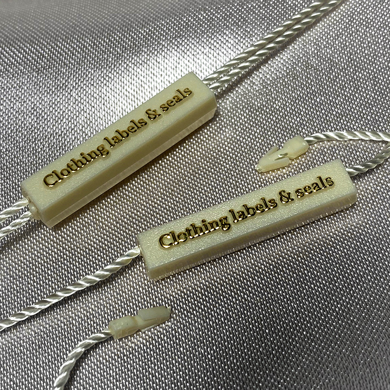 Custom plastic seal tag ST-M209 for fashion products, such as clothes, footwear, bags, jewelry, clothing accessories, etc.