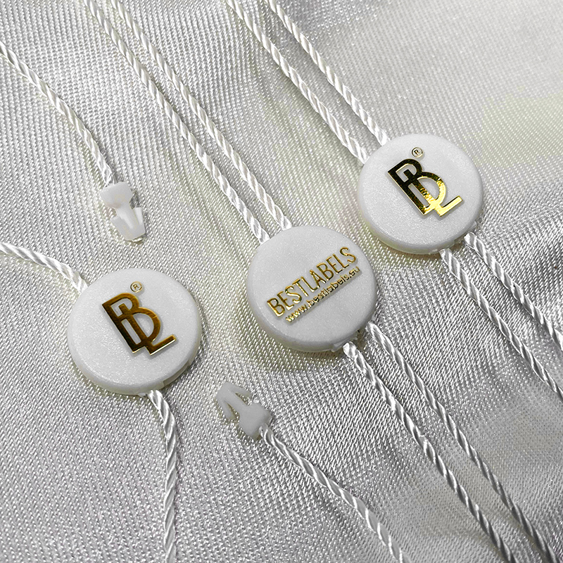 Plastic seal ST-M54 with a round shape, very elegant and beautiful customized on two sides with the Brand name or emblem, suitable for clothes, shoes, bags, etc. This type of seal is made of high quality materials, using the most advanced technologies in the field.