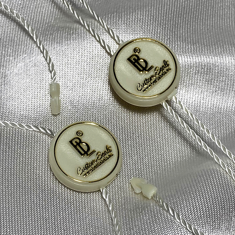 Plastic seal ST-M88 with a round shape, very elegant and beautiful customized on two sides with the Brand name or emblem, suitable for clothes, shoes, bags, etc. This type of seal is made of high quality materials, using the most advanced technologies in the field.