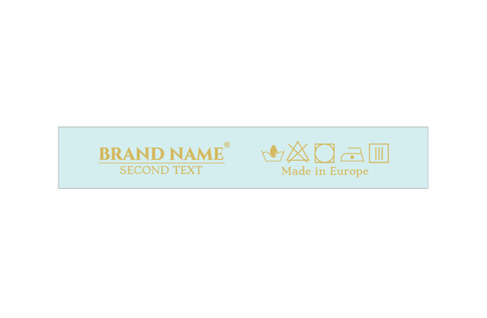 Laundry care label customized with washing symbols, and the Brand name or logo, model TL-119 suitable for any textile product, especially clothing items. This type of textile label is made using the most advanced technologies in the digital printing field on a textile support. The labels are printed on a special satin by thermal transfer method, with an impressive print quality and high wash resistance.