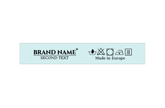 Laundry care label customized with washing symbols, and the Brand name or logo, model TL-126 suitable for any textile product, especially clothing items. This type of textile label is made using the most advanced technologies in the digital printing field on a textile support. The labels are printed on a special satin by thermal transfer method, with an impressive print quality and high wash resistance.