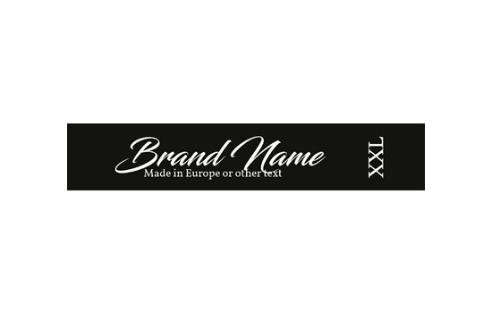 Frabric Brand label with size indicator, customized with texts printed on satin with different colors, suitable for clothes, clothing accessories and various textile products. This type of textile label is made using the most advanced technologies in the digital printing field on a textile support. The labels are printed on a special satin by thermal transfer method, with an impressive print quality and high wash resistance.