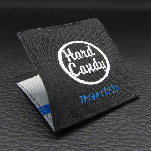 Textile label folded in the middle, customized with Digital High Density embroidered inscriptions.