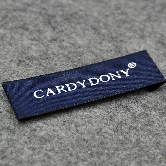 Textile label customized with Digital High Density embroidered inscriptions, with rectangular shape and folded edges.
